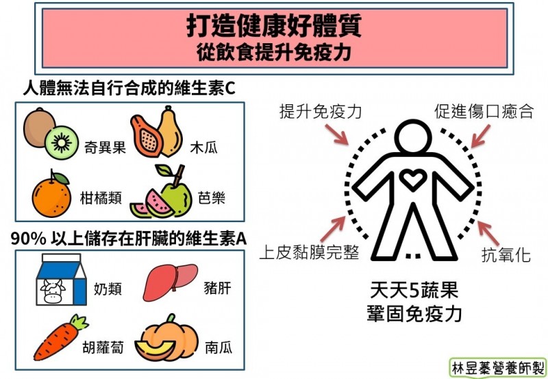 另,維生素A可以維持上皮細胞的完整性、調節免疫力,可從豬肝、奶類、胡蘿蔔、南瓜等均衡飲食攝取。